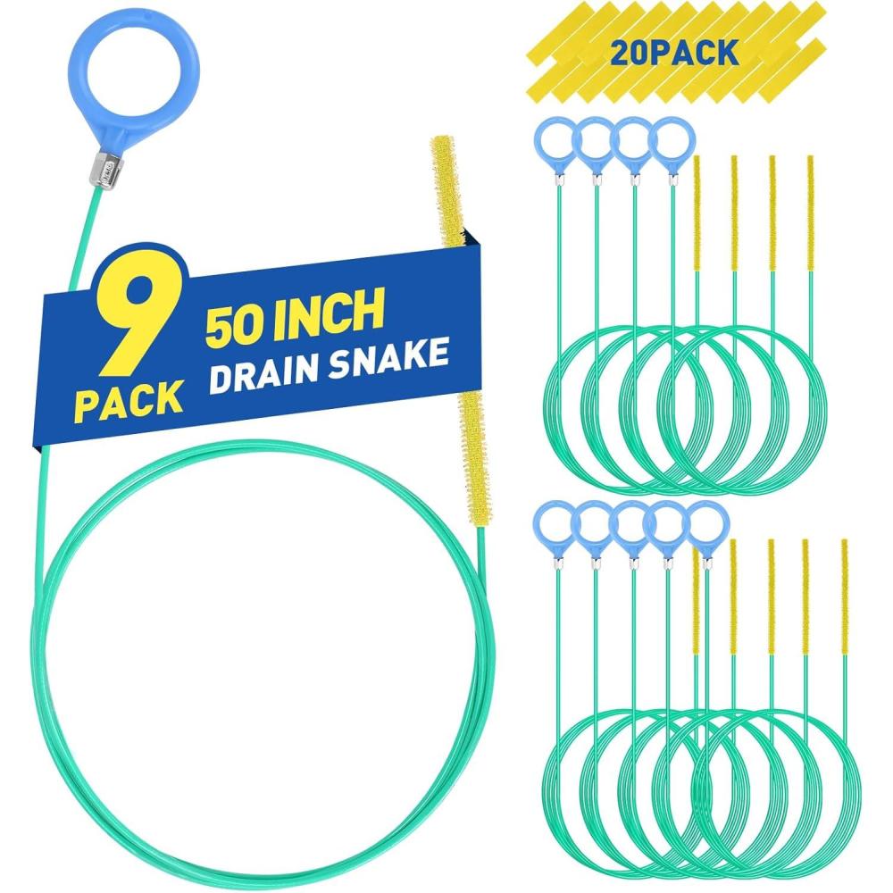 [50inch Drain Snake]:9Pcs snake drain hair remover tools,20Pcs DIY Velcro strips,1Pc DIY instruction manual,DIY post Velcro diameter:0.39inches,sink snake can be inserted into deeper narrow pipes, cleaning hair, picking up blockage and daily pipe cleaning