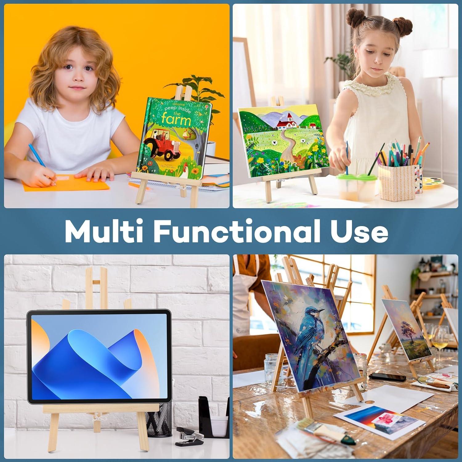 【Canvas with Easel】: easel is carefully crafted from sturdy pine wood. 30 cm (11.8 inches) high and 18 cm (7.1 inches) wide. The wooden surface is smooth, with sturdy A-shaped triangular frame structure, providing stable support when you create. The easel is easy to install, with flexible angle adjustment, and can be used in conjunction with multi size art boards. The groove design of the bottom crossbar can well accommodate canvas and wooden boards.