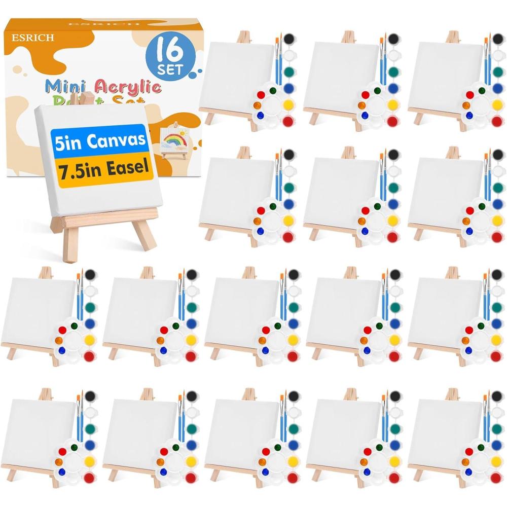 ESRICH 20 Set Mini Canvas Painting Kit, Minis Acrylic Paint Set, Valentines Day Gifts,4*4in Stretched Canvas with Easel, Acrylic Paints,Brushes,Palette,Mini Easel Canvas for Kids Adults Painting Party(16 set 5*5)