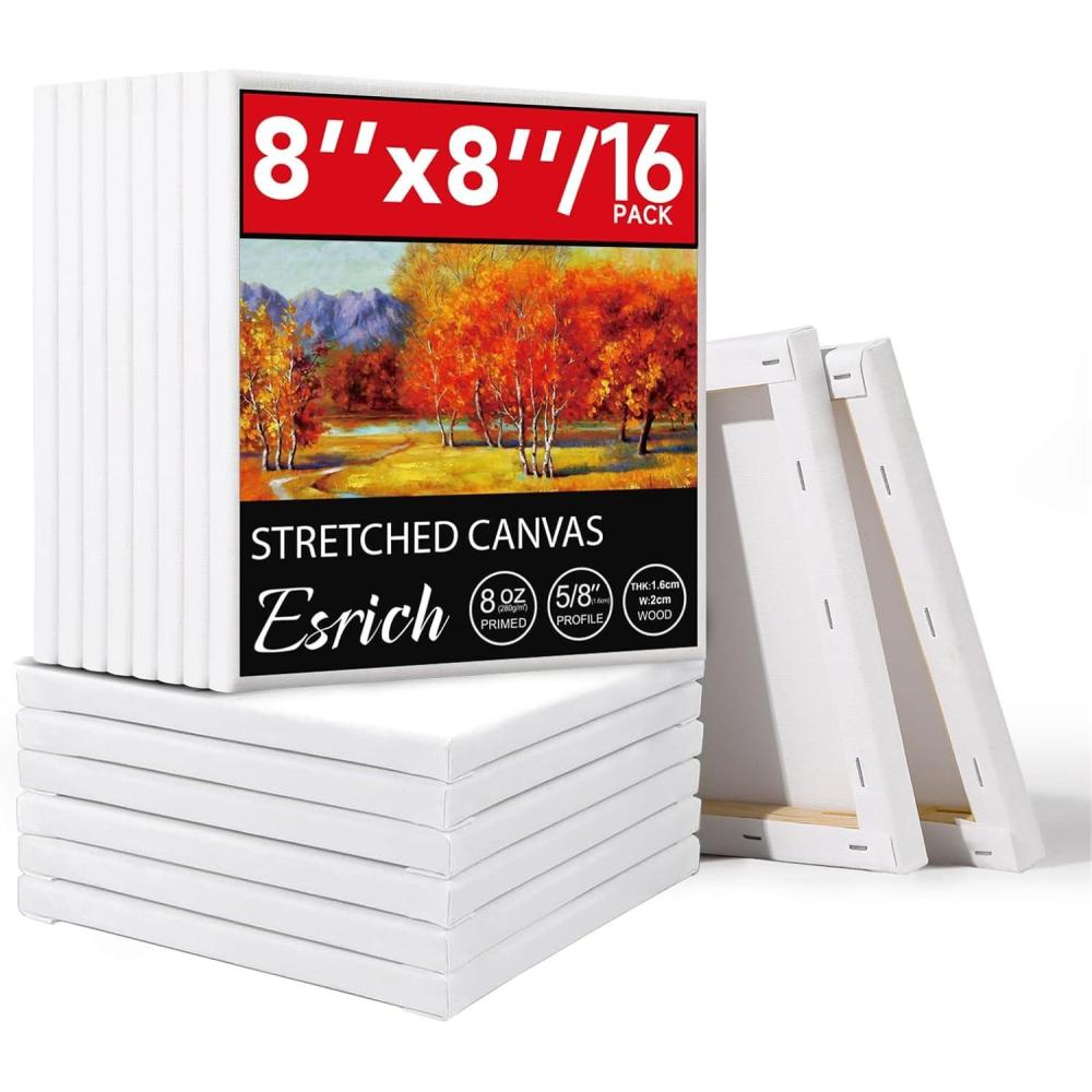 ESRICH 4 Pack Stretched Canvas for Painting with 9×12, 5×7, 4×4, 3×3, Primed Acid-Free Cotton Blank Canvases for Painting, Painting Canvas for Oil & Acrylic Paint.(8x8in-16P)